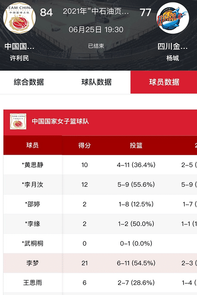 这场比赛中国女篮球员们面对男队表现积极主动,其中有着“女版詹姆斯”之称的MVP级球员李梦砍下了21分,她全场11中6,效率非常高。中国女篮的核心之一邵婷只有2分入账,8中1说明了她的手感还需要继续寻找。黄静思砍下10分,李月汝拿下12分,王思雨和杨力维均拿下了6分。