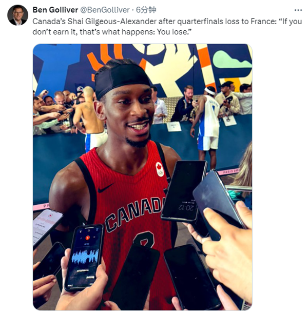 第二节,加拿大男篮的处境十分被动,亚历山大找回手感,大秀招牌中投,单节7中4独砍11分,无奈亚历山大独木难支,法国队亚布莱塞和莱索尔带队强势回击,半场打完加拿大29-45落后16分,亚历山大半场独砍13分。