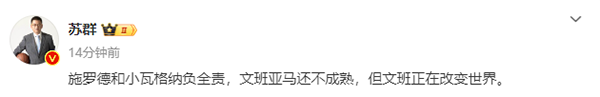 对于德国男篮惜败法国,国内篮球评论员苏群表示:施罗德和小瓦格纳负全责,文班亚马还不成熟,但文班正在改变世界。
