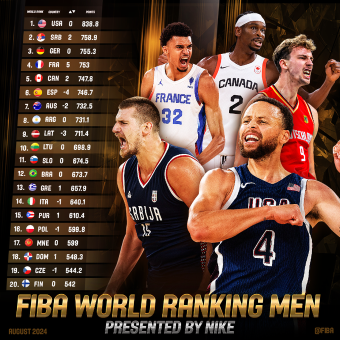 来源:直播车08-16 10:26直播车讯 随着 2024 年巴黎奥运会的圆满结束,FIBA 官方及时公布了男篮最新的世界排名情况,这一排名的变动引发了广泛关注。
