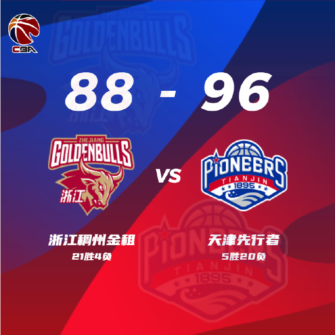 直播车1月12日讯 CBA常规赛继续进行,领头羊浙江迎战天津,天津近期遭遇四连败后战绩来到4胜20负,目前仅列联赛倒数第三,浙江迎来连胜后战绩更新为21胜3负,继续领跑全联盟。比赛一上来两队进攻稍显滞涩,中段浙江率先找到进攻状态,内外结合的他们逐渐占据上风,首节结束时浙江暂时领先9分,次节回来,天津外线手感滚烫连中三分,双方分差逐渐被缩小,吴前连续突破得手率队稳住局势,半场战罢,浙江依然保有6分优势。易边再战后场上形势风云突变,浙江进攻断电单节仅得到14分,天津延续追分势头,中段一波9-0实现反超,末段浙江进攻依然滞涩,三节结束后天津反超5分,末节上来,浙江找回手感接连追分,无奈天津总能给予回应,决胜时刻双方陷入缠斗,杰弗森飚中冷血三分,浙江追分未果,最终天津96-88力克浙江。