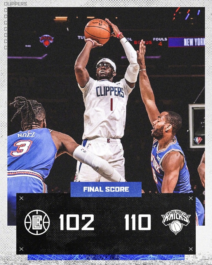 直播车1月24日讯 NBA常规赛继续进行,尼克斯主场迎战快船,尼克斯本赛季状态堪忧,目前又是3连败目前排名东部第11位,而快船虽然缺少两大主力,但依然排在西部第8位,本场比赛沃克因伤缺席。开局尼克斯上来就手感火热接连在外线发炮建立领先,而快船则是从内线打起追分,后半节双方相继在外线下起三分雨,尼克斯更胜一筹领先了8分,次节双方手感都有回落,尼克斯先打出小高潮领先到双位数,而雷吉也找到手感带领快船连续打出两波进攻高潮追近至5分分差。第三节,双方命中率还是不高,快船更是上来就陷入得分荒,尼克斯抓住机会重新领先到双位数,雷吉和兰德尔也展开对攻,尼克斯凭借外线三分稳住双位数领先优势,末节雷吉带领快船多次试图掀起反攻,但尼克斯今天火热的外线手感始终能给出回应,分差也一直保持在10分左右,最终尼克斯主场力克快船,终止自己的3连败。