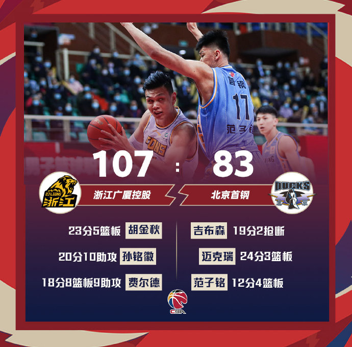直播车4月9日讯 今日CBA常规赛,广厦迎战北京。广厦29胜21负排名积分榜第6,北京27胜23负排名积分榜第9。比赛开始后,双方身体对抗激烈,不断冲击对方内线造成罚球,比分交替上升,首节双方战成23平。第二节上来后双方依旧保持胶着,北京依靠两记三分暂时取得领先,随后广厦依靠中距离与罚球始终紧咬比分,双方打成44平结束上半场争夺。下半场开始后,广厦开始发力,孙铭徽里突外投单节砍下14分,胡金秋也内线发力连续打成二加一,最后阶段,北京连续站上罚球线,依靠罚球缩小比分。三节战罢,广厦领先北京6分。最后一节,广厦内外兼修连续得分不断扩大领先优势,分差一度来到28分,北京尝试追分无奈分差太大无力回天。最终,广厦107-83大胜北京。
