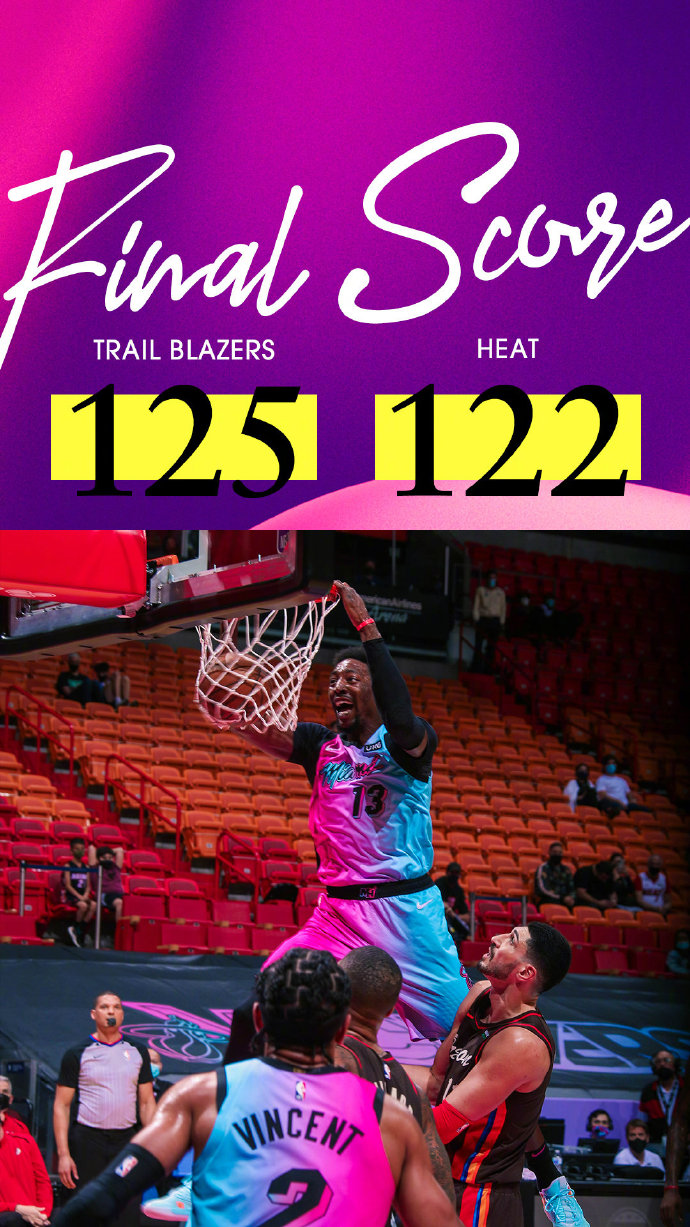 直播车3月26日讯 NBA常规赛,热火主场迎战开拓者,热火最近已经4连败掉落至东部第5位,开拓者也是2连败排在西部第6位,但交易截止日刚刚过去,因涉及到伤病、交易等,热火巴特勒等多名球员本场缺战。开局上来开拓者打出10-2开局建立优势,麦科勒姆也是手感火热连续砍分,开拓者在麦科勒姆单节21分的带领下首节结束领先7分,次节热火三分手感不错将分差反超,随后双方展开拉锯战,半场结束热火只落后1分。下半场双方还是非常胶着的拉锯战,你进一个我还一个,麦科勒姆状态依然不错,热火众将也能回应上,三节结束双方打平,末节热火突然找到外线手感连续扔进5记三分一举建立优势,但利拉德带领打出一波11-0又将比分反超回来,最后时刻双方连续打成,比分交替领先,利拉德三分造犯规罚球绝杀,开拓者险胜热火,送给对手5连败。