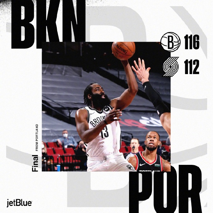 篮网(30-14):哈登25分7板17助2断、杰夫-格林20分4板、乔-哈里斯17分、克拉克斯顿16分9板、鲁瓦乌11分4板3助、T-约翰逊8分3板2助、布朗8分4板、格里芬8分5板2断、小乔丹3分10板。