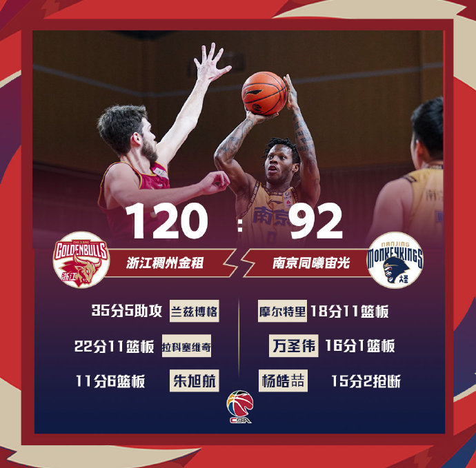 浙江(31-8):兰兹博格35分5助、拉科塞维奇22分11板、林孝天11分、朱旭航11分6板、王奕博11分、吴前10分6助。
