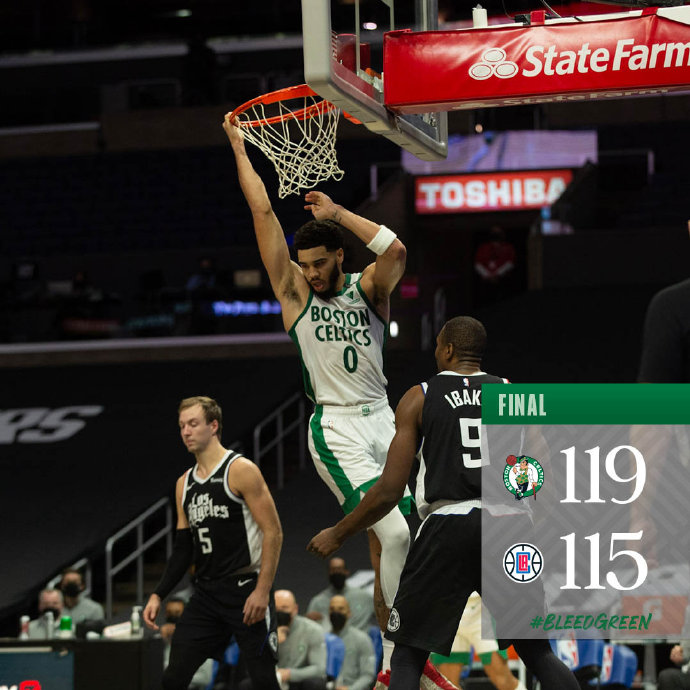 直播车2月6日讯 快船今日坐镇主场迎来凯尔特人的挑战,乔治因右脚酸痛缺席比赛,布朗则因膝盖不适同样缺阵。首节开局肯纳德成为奇兵连续命中三分帮助快船打出15-4的开局并早早确立起领先,而这波进攻高潮也是快船在上半场一路保持领先的基础,绿军虽然之后找回进攻感觉但无法阻止对手,半场结束时快船领先绿军11分。下半场场面风云突变,绿军外线突然下起三分雨,以塔图姆为首的绿军打出一波26-6的攻势一举扭转比分,不过快船也在随后及时做出回应,路威拿下关键9分帮助快船追上比分,小卡连拿4分更是实现反超。但关键时刻小卡出现两次致命失误,绿军凭借5次罚球机会和沃克的跳投反超比分。最终,绿军客场击沉快船拿下比赛。