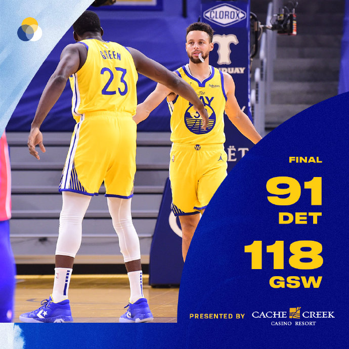直播车1月31日讯 勇士今日坐镇主场迎战活塞,首节比赛勇士三位核心库里、维金斯和乌布雷合力砍下23分,活塞则进攻断断续续完全找不到感觉,勇士首节便取得12分领先,次节活塞进攻端虽然有所回暖但勇士手感更热,节中勇士一波14-3的攻势一度取得23分领先,半场结束时勇士就以64-45领先活塞。下半场局面依旧,勇士每一节都占据上风不断扩大领先,第三节末段勇士就将领先扩大至30分以上早早就奠定了胜局。最终,勇士大胜活塞迎来最近4场比赛里的第3场胜利。