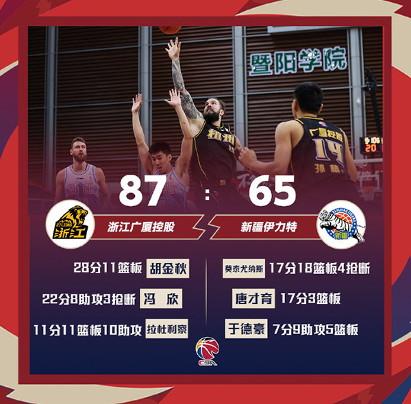 广厦(16-14):胡金秋28分11板、冯欣22分8助、拉杜利察11分11板10助、赵嘉仁8分、孙铭徽6分5板4助。