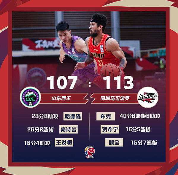 深圳(15-13):布克40分6篮板6助攻、贺希宁16分5篮板3助攻、顾全15分7篮板、卢艺文12分5篮板3助攻、伯顿8分6助攻、卢鹏羽7分、沈梓捷6分11篮板2抢断2盖帽、于梁5分、杨林祎2分3篮板、买尔丹2分