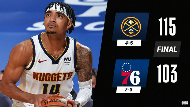 掘金(4-5):哈里斯21分3板、穆雷14分4助、约基奇15分9板12助、巴顿14分3板3助3断、米尔萨普9分5板2断、贾玛考-格林12分6板、莫里斯12分4助。