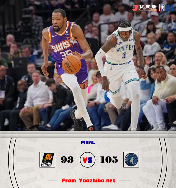 直播车4月24日讯 NBA季后赛首轮G2,森林狼主场迎战太阳,首场比赛森林狼拿到大胜,1-0领先。比赛开始,太阳很是慢热,3分钟内没得分,森林狼打出8-0不错开局,阿伦三分终于开局,森林狼接连打内线继续拉大分差,杜兰特手感不佳,布克造杀伤能追分,唐斯首节就领到3次犯规,首节太阳落后3分,次节森林狼进攻端受阻,比尔里突外投连砍7分,太阳顺势一波小高潮反超比分,康利里突外投单节上双止血,半场太阳仅领先1分。下半场,阿伦受伤上场,唐斯里突外投连砍6分,麦克丹尼尔斯内线也能连续取分,森林狼一波小高潮重新建立7分领先,末节太阳又是突然崩盘,康利三分命中后麦克丹尼尔斯接连上篮命中,森林狼11-0领先到17分,太阳喊掉最后一次暂停,森林狼牢牢掌握住双位数领先,最终森林狼105-93再胜太阳,2-0领先。