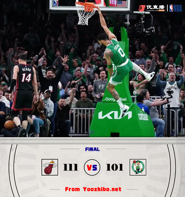 直播车4月25日讯 NBA季后赛东部首轮G2,凯尔特人继续主场迎战热火,首场比赛凯尔特人取得20分大胜,目前1-0领先,本场比赛巴特勒继续伤缺。比赛上来,双方都迅速进入比赛状态,塔图姆状态火热,里突外投单节轰下14分,而热火则是多点开花,依靠他们并不擅长的三分球给出回应,首节热火扔进8记三分领先了1分,次节凯尔特人终于找到外线手感,一波11-4进攻波反超比分,但马丁和希罗外线也是手感火热能给出回应,双方展开对攻战,杰伦-布朗发力单节轰15分带领绿军半场反超3分。下半场,双方继续拉锯战,杰伦-布朗还保持不错状态,但马丁和希罗继续能给出回应,热火一波小高潮一度反超双位数,双探花联手追到差6分,末节赖特、海史密斯和哈克斯接连三分打破队史季后赛纪录,面对绿军追分,热火都能回应且掌握10分左右领先,最终热火111-101力克凯尔特人,大比分扳成1-1。