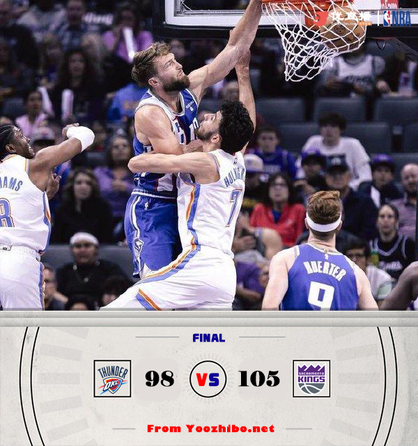 直播车11月11日讯 NBA常规赛西部季中锦标赛C组,国王主场对阵雷霆。比赛开始,许尔特手感火热,单节砍下15分帮助国王取得两位数优势,雷霆外线手感不佳,只能不断冲击篮筐拿分缩小分差,次节国王命中率下降,雷霆趁势继续迫近比分,半场战罢雷霆42-53落后。易边再战,雷霆持续发力完成16-4的攻击波将分差缩小到只剩2分,基根-穆雷连得6分稳住局势,末节双方围绕10分左右分差展开激烈争夺,最后时刻雷霆连续打铁失误葬送希望。最终,雷霆98-105客场不敌国王。