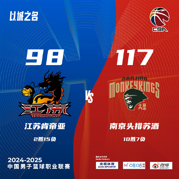 直播车讯2024年12月14日讯 CBA常规赛,江苏和同曦迎来德比。江苏目前2胜14负,同曦9胜7负。一开场,双方势均力敌,比分始终紧咬,江苏不断冲击内线频频得手,同曦内外开花迅速回应,次节同曦占得先机,此后却突然哑火,江苏轰出17-0强势反超,郭昊文高效发挥带队追赶,半场战罢双方战成60平。下半场,郭昊文延续火力,得分助攻一肩挑带队将分差拉开到两位数,末节林葳连中三分将分差拉开到20分,江苏大势已去无力回天。最终,同曦117-98击败江苏,赢下德比。