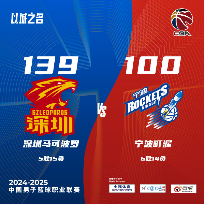 直播车讯12月20日讯 CBA常规赛,深圳对阵宁波,深圳上场比赛惜败上海,宁波最近遭遇4连败。开场后汤普森在内线表现强势,宁波先发外线手感不错连连命中三分,周鹏替补登场后首节独得10分帮助深圳扩大优势。第二节汤普森在内线依旧予取予求,马凯尔-约翰逊和威姆斯也开始发挥,深圳连连打出攻势将分差拉大到20分,宁波也主要依靠外援追分。易边再战,汤普森上来依旧状态火热连连远投命中,宁波虽然没能缩小分差,但也没有让分差继续被拉大。不过第四节深圳全面开花单节再度打爆宁波,场上分差一路被拉大,最终深圳139-100大胜宁波,宁波遭遇5连败。