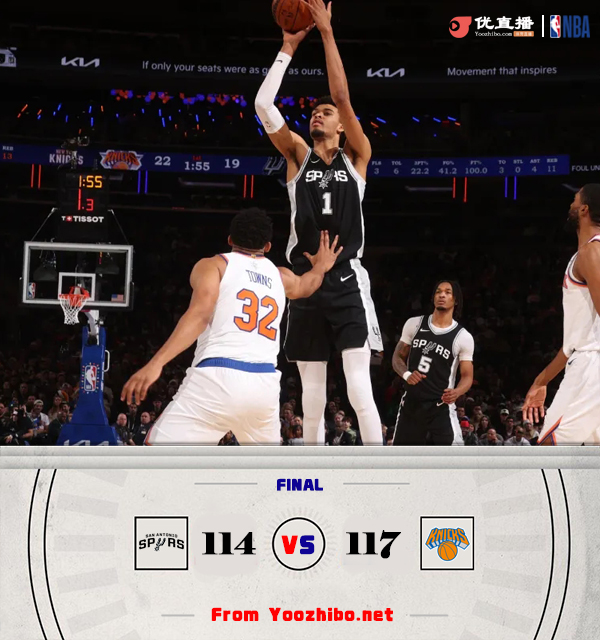 直播车12月26日讯 NBA圣诞大战,马刺客场挑战尼克斯。马刺15胜14负西部第九,尼克斯19胜10负高居东部第三。比赛开始,双方开场势均力敌,比分交替领先,唐斯不断冲击篮筐,文班亚马连中三分给出回应,次节马刺持续发力,文班亚马内外开花连续拿分,布里奇斯稳定输出带队咬住,马刺打出11-2以58-51领先结束上半场。易边再战,尼克斯占得先机,布里奇斯和唐斯联手拿分带队迅速反超,末节马刺轰出16-6夺回领先,尼克斯外线开火连中三分强势回应,关键时刻布里奇斯延续火力带队确立优势,保罗三分续命,哈特连续抢到前场篮板耗尽时间杀死比赛。最终,尼克斯117-114力克马刺。