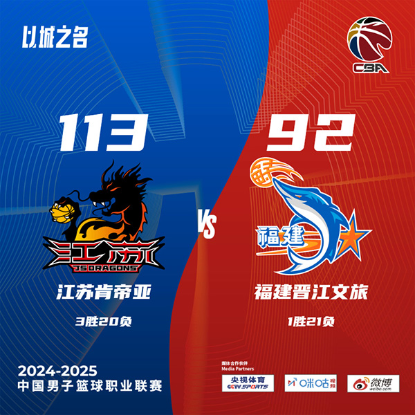 直播车讯北京时间12月27日讯 CBA常规赛副班长之争,江苏今日迎战福建,前者近来遭遇六连败,赛季至今只赢下两场比赛,后者则是13连败,赛季至今只拿到一场胜利。比赛上来,两队就打得十分胶着,场上比分交替领先,不过福建早早犯满让他们一度处于劣势,好在是咬住了比分,首节战罢双方战至26-26平,次节福建还是败下阵来,他们的进攻问题很大,单节得分未能上20分,江苏这边古德温状态神勇,在他的带领下江苏半场领先10分;下半场回来,福建打出一波12-2的攻势迅速抹平分差,紧要关头又是古德温站出来连续得分,江苏回应9-0的小高潮,分差在末节已经突破了二十分,比赛彻底失去悬念,最终江苏大胜福建,结束六连败的同时也送给后者14连败。