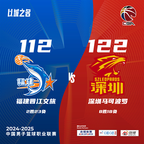 直播车讯北京时间1月3日讯 CBA常规赛,福建主场迎战深圳,福建目前2胜22负联盟垫底,深圳7胜18负排在第16位。比赛开始,黎璋霖率先发力连砍7分带队11-0小高潮建立主动权,但周鹏上篮里突外投连砍10分帮助深圳咬住比分,首节深圳仅落后1分,次节双方展开胶着拉锯战,深圳连续前场篮板一度反超,但福建接连三记三分一波12-0强势稳住局势,随后深圳4分钟内连续5记三分强势回应并在半场反超2分。下半场,贺希宁接连3记三分,深圳顺势一波进攻波拉开双位数领先,随后双方展开拉锯战,三节深圳领先到17分,末节威姆斯接连中投还能命中,周鹏外线也能提供火力,但随后深圳接连吃T,福建趁机追到个位数,威姆斯和贺希宁接连三分稳住局势,最终深圳122-112力克福建,拿到3连胜。