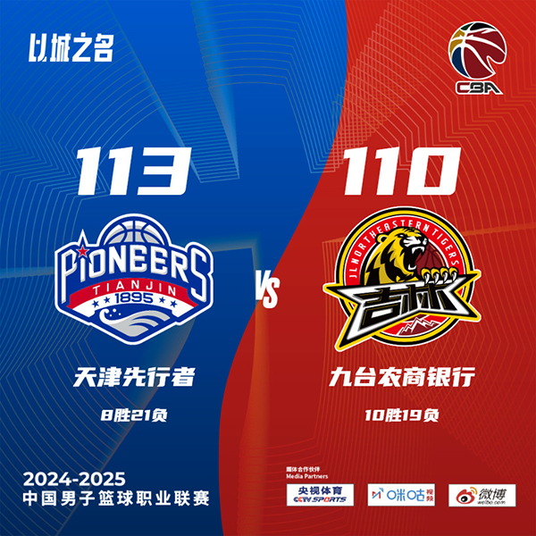 直播车讯 北京时间1月11日讯 CBA常规赛,天津主场迎战吉林。天津7连败,以7胜21负排在联赛倒数第三,吉林3连败,以10胜18负排在联赛第十三。上半场,天津率先发力,多点开花取得两位数领先,吉林不断冲击内线连投带罚拿分追赶,大卫-詹姆斯火力全开,半场狂砍31分帮助天津65-62领先吉林结束上半场。下半场,大卫-詹姆斯延续火力,天津持续输出将分差拉开到两位数,末节天津命中率下降,吉林展开反击将分差迫近到只剩5分,刘天意关键两罚不中,拉维特罚球杀死比赛。最终,天津113-110力克吉林,结束了自己的7连败,