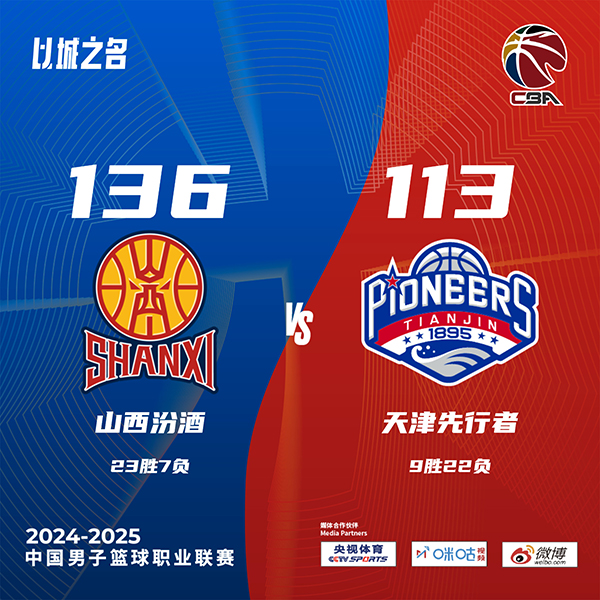 直播车讯 北京时间1月15日讯 CBA常规赛,山西主场迎战天津,山西目前22胜7负高居第3位,天津则是9胜21负排在第15位。比赛开始,双方都比较快得进入状态,天津全面皆兵,首发五虎除大卫-詹姆斯皆有得分入账,而山西则是古德温里突外投撑起进攻,山西首节领先4分,次节山西替补开始发力,张宁上来里突外投连砍12分,大卫-詹姆斯连续三分止血,但山西外线多点开花直接在半场拉开20分以上领先。下半场,拉维特苦苦支撑带队追分,但山西多点开花能回应,双方围绕着20分左右分差展开拉锯战,末节迪亚洛里突外投继续扩大领先,分差一度来到近30分,最终山西136-113轻取天津。