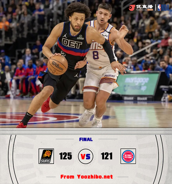 直播车讯 1月19日讯 NBA常规赛,太阳客场挑战活塞。太阳20胜20负排西部第十,活塞21胜20负列东部第八。比赛开始,双方开场势均力敌,比分始终紧咬,布克高效输出,托拜亚斯-哈里斯连续拿分给出回应,理查兹强攻内线连投带罚拿分,活塞多点开花还以颜色,半场战罢太阳61-60领先活塞。易边再战,活塞持续发力一度取得7分优势,杜兰特挺身而出连投带罚单节狂砍21分带队反超,末节双方争夺陷入白热化,关键时刻杜兰特和布克连续拿分取得微弱优势,活塞苦苦追赶无果,最终,太阳125-121力克活塞,客场过关。