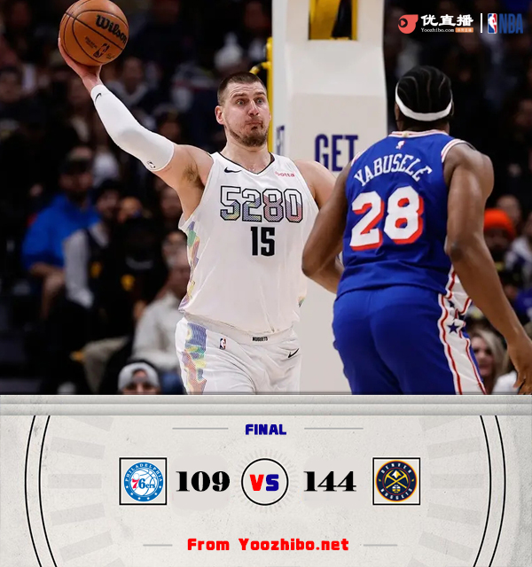直播车讯 北京时间1月22日讯 NBA常规赛,掘金主场迎战76人。掘金26胜16负稳居西部第四,76人15胜26负排东部第十一,近期更是遭遇6连败。恩比德继续缺阵。一开场,双方短暂相持,随后掘金内外开花一举取得两位数优势,乔治三分止血,次节双方围绕10分左右分差展开拉锯战,掘金连中三分,马克西内外开花顽强咬住,半场战罢掘金77-67领先76人。下半场,掘金延续火力,多点开花将优势扩大到20分以上,末节掘金稳扎稳打,76人大势已去无力回天。最终,掘金144-109大胜76人,送给对手7连败。