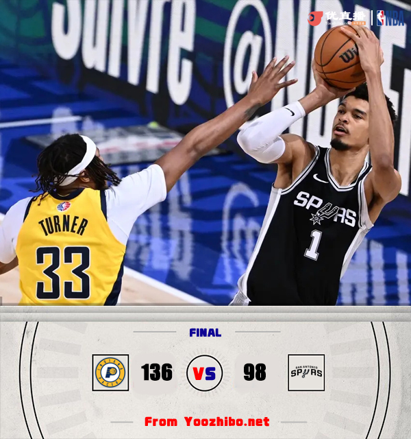 直播车讯 北京时间1月26日讯 NBA常规赛巴黎赛,马刺继续对阵步行者。马刺20胜22负排西部第12,步行者24胜20负东部第5。比赛开始,双方开场势均力敌,比分咬得很紧,步行者内外开花取得两位数优势,次节马刺不断冲击内线得手扳平比分,步行者三分3连击稳住局势,马刺突然哑火,半场战罢步行者65-50领先马刺。易边再战,马刺大举反击,文班亚马攻防两端立功带队反超,哈利伯顿挺身而出三分4连击帮助球队重获两位数优势,末节步行者攻防两端发力打出8-0的攻击波一举将分差拉开到20分以上,马刺大势已去无力回天,沃克击中西索科头部被吹一级恶犯,马穆凯拉什维利推飞布莱恩特被吹二级恶犯直接驱逐。最终,步行者136-98大胜马刺,完成复仇。