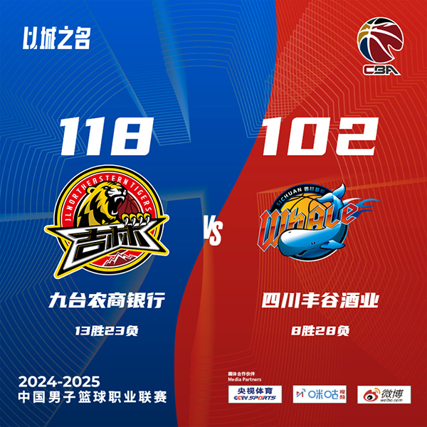 直播车讯北京时间3月5日讯 CBA常规赛战火重燃,吉林坐镇主场迎战四川,四川目前8胜27负排在联赛第17位,吉林12胜23负位列第14。此役一上来双方早早进入状态陷入僵持,琼斯连续取分对飚萨姆纳,首节结束时吉林领先2分,次节回来,双方延续火力拉开对攻,萨姆纳联手亨特不断打进,但基兹林克单节狂揽20分强势回应,半场战罢,吉林确立10分优势。短暂休整后王薪凯连中三分掀起反扑号角,四川多点开花蚕食分差,三节结束后吉林仅领先1分,末节决战,四川进攻彻底断电,吉林延续火力终结悬念,最终吉林118-102击败四川送对手7连败。