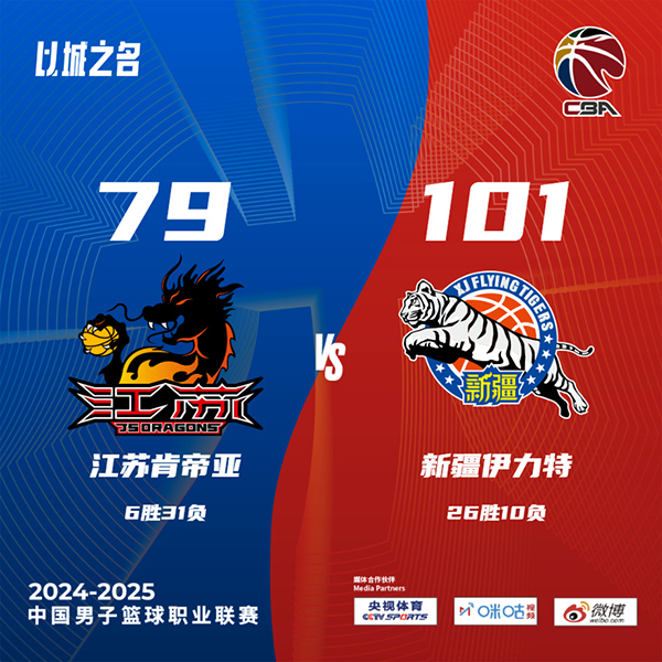 直播车讯北京时间3月8日讯 CBA常规赛,江苏主场迎战新疆,江苏目前2连败后6胜30负排在第19位,新疆则是25胜10负排在第8位。比赛开始,崔晓龙接连三分打得很主动,但赵睿里突外投连砍9分带队回应11-0直接建立主动权,杰克逊接连止血,但新疆给出回应首节领先到16分,次节江苏进攻端停滞,新疆发力13-3直接拉开20分以上领先,随后江苏接连失误被新疆打成反击,半场新疆领先到31分。下半场,新疆进攻端有些松懈,江苏两位外援带队追分,但赵睿接连突破稳住局势,新疆重新稳住近30分领先,末节双方命中率都有下降,但新疆还是掌握住20分以上领先,随后双方练兵,最终新疆101-79大胜江苏。