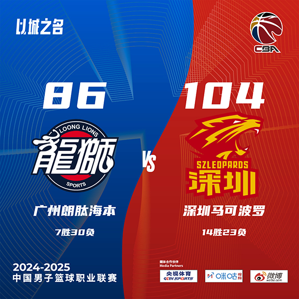 直播车讯北京时间3月8日中国男子篮球职业联赛 常规赛,广州朗肽海本对阵深圳马可波罗。半场广州42-55深圳,最终广州86-104深圳。广州朗肽海本张兴亮16分4板3助,袁照耀12分5板1助;深圳马可波罗马凯尔-约翰逊24分4板9助,贺希宁23分4助。