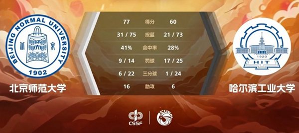 直播车讯3月12日 CUBAL东北赛区小组赛,北京师范大学对阵哈尔滨工业大学。首场小组赛,两队皆获胜。比赛开始,吴士广篮下先拿2分为北京师大开局,哈工大开局很是慢热被北京师大打出9-0开局。打了3分钟杨淳君终于为哈工大开局,周鑫也连续得分,但吴士广补篮回应,肖洋三分开和后北京师大领先到双位数。周鑫三分再止血,吴士广继续二次进攻打成,首节北京师大26-12领先哈工大。次节上来,哈工大进攻端还是不在状态,北京师大顺势扩大领先。辛泽林造杀伤终于打破僵局,但两队进攻端命中率都不高,场上频频打铁。随后高梓淇接连三分命中帮助北京师大稳住领先优势,杨淳君连续前场篮板终于打成二次进攻拿到运动战进球得分,半场北京师大43-26继续领先哈工大。易边再战,双方连续几回合尝试三分但都没有命中,打了3分多钟各自仅得2分。杨淳君冲击造杀伤、强打2+1带队追分,北京师大及时调整,邵振恒站出来连续抢到前场篮板,里突外投三分也开和砍下7分强势回应。哈工大还是依靠拼抢前场篮板获得进攻机会,连续罚球追分,但三节北京师大57-46还领先哈工大11分。末节决战,双方上来又是连续打铁,邵振恒连攻加传帮助北京师大牢牢掌握住十几分领先。江龙接连打成二次进攻止血,但肖洋三分被犯规后三罚全中再回应,随后肖洋里突外投再连得6分杀死比赛,最终北京师大77-60战胜哈工大。