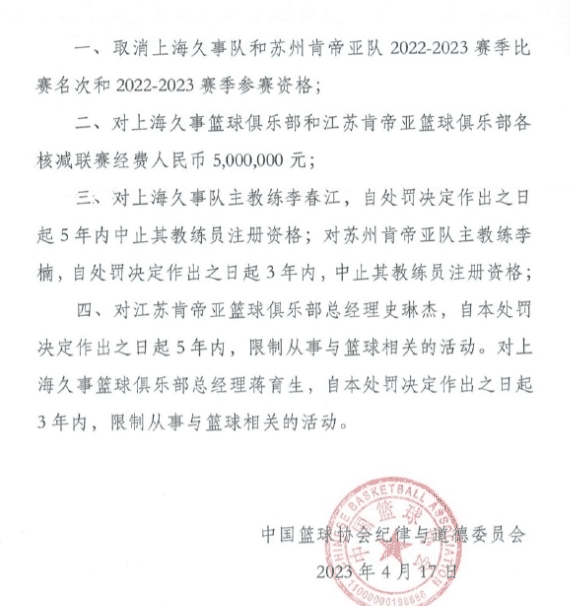来源:直播车04-17 16:12直播车04月17日中国篮协公布了重磅罚单,针对季后赛12进8系列赛G3,上海男篮击败江苏男篮最后两分钟的戏剧性,被证实双方消极比赛,两队各被罚款500万,李春江禁赛5年,李楠禁赛3年。上海和江苏男篮的总经理蒋育生和史琳杰限制3年、5年内无法从事篮球相关活动。