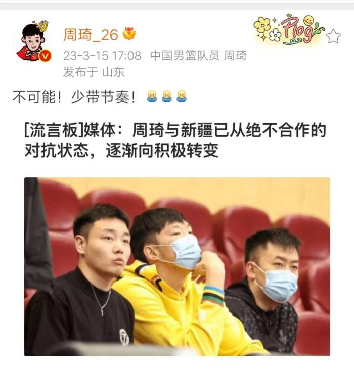 新疆回来,周琦缓和,一切好像要到大结局的样子,可是周琦的现身回应打破了这一团和气,在社交媒体上,周琦转发了报道自己态度缓和的动态表示:“不可能,别带节奏。”之后在社交媒体上,周琦也是明确表态,绝对不妥协,绝不可能与新疆男篮再合作。
