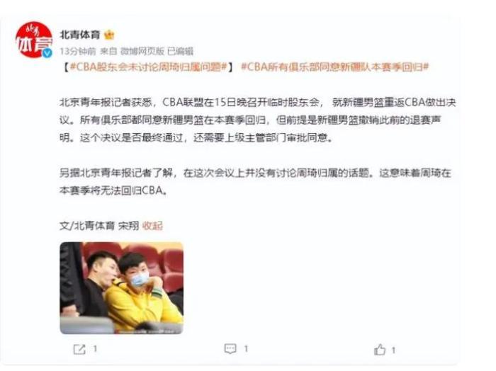根据报道,15日的临时会议更多讨论的是新疆男篮的回归以及积分如何计算等等内容,而周琦的归属并没有列上议程,这也意味着周琦很难在爱本赛季回归CBA。