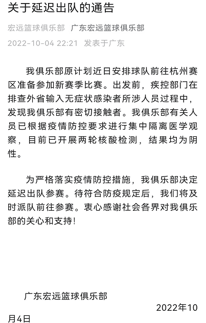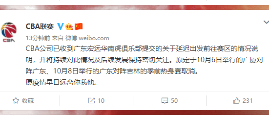 CBA公司已收到广东宏远华南虎俱乐部提交的关于延迟出发前往赛区的情况说明,并将持续对此情况及后续发展保持密切关注。原定于10月6日举行的广厦对阵广东、10月8日举行的广东对阵吉林的季前热身赛取消。愿疫情早日远离你我他。