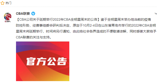 来源:直播车09-26 11:25直播车09月26日距离新赛季CBA常规赛还有半个月就要开始,而上个赛季的全明星还没有举办。原定于2022年2月份举办CBA全明星,易建联837539票当选票王,辽篮和广东都是4名球员进入到首发。可惜因为疫情的原因,CBA全明星推迟,时间是10月初期,举办地换成了青岛。但如今青岛有疫情,CBA全明星再度延期,如今有消息称联赛公司初步计划上赛季全明星将在11月底举办,也就是第一阶段和第二阶段期间,地点依旧是青岛。