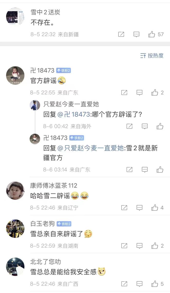 “雪中2送炭”的回复几乎也是辟谣了篮球媒体人“starxia澳洲篮球”的爆料,很多球迷也是喊话:“雪总,总是能给我安全感。”、也有的球迷表示“雪总亲自出来辟谣了。”