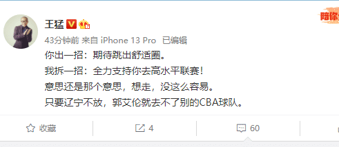 知名篮球人王猛进行解读,称:“你出一招:期待跳出舒适圈。我拆一招:全力支持你去高水平联赛!意思还是那个意思,想走,没这么容易。只要辽宁不放,郭艾伦就去不了别的CBA球队”