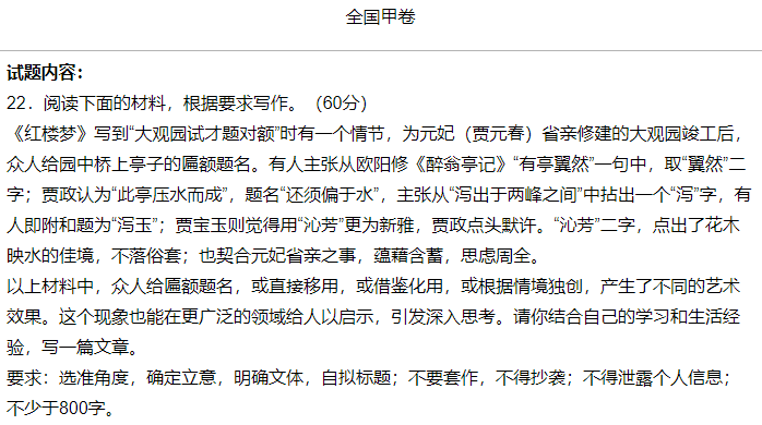 来源:直播车06-07 14:40直播车06月07日讯,高考作文出炉,这其中有我们非常熟悉的题材,比如“全国乙卷”的北京双奥之城,2008年北京奥运会和2022年北京冬奥会的题材,当然也有令人感到头疼的题材,目前在网络上最火的就是“全国甲卷”的红楼梦题材,指的是大观园竣工众人给园中桥上亭子的匾额题名的事情,根据这个材料,写一篇不少于800字的作文,几乎公认的今年高考作文最难的一个题材。