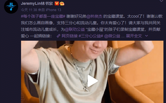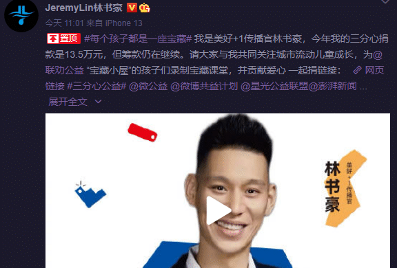 林书豪晒出了一段自己教给小朋友转篮球的视频,同时发起活动,配文称:“我是美好+1传播官林书豪,今年我的三分心捐款是13.5万元,但筹款仍在继续。请大家与我共同关注城市流动儿童成长,为“宝藏小屋”的孩子们录制宝藏课堂,并贡献爱心”
