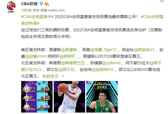 经过球迷们三周的踊跃投票,2022CBA全明星赛首发球员票选名单出炉(总票数包括主会场及赞助商分会场)