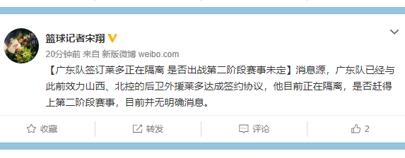 篮球记者宋翔在社交媒体上表示:【广东队签订莱多正在隔离 是否出战第二阶段赛事未定】消息源,广东队已经与此前效力山西、北控的后卫外援莱多达成签约协议,他目前正在隔离,是否赶得上第二阶段赛事,目前并无明确消息。