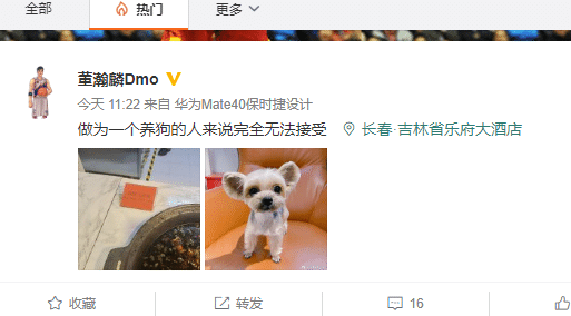 这是在1月5日,CBA上海男篮球员董瀚麟在社交媒体上晒出了自己赛区酒店的狗肉豆腐汤,同时还加上了自己养的宠物狗照片,配文:“做为一个养狗的人来说完全无法接受”。
