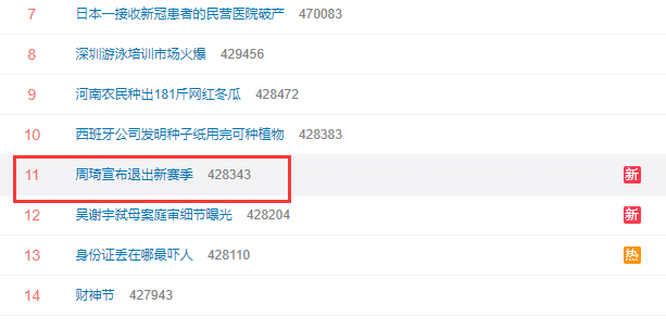 周琦退赛的事情很快就登上了热搜榜的前列,引发全民关注,其中“周琦宣布退出新赛季”的相关话题,实时搜索人数高达数十万,外界对于周琦的行为也是褒贬不一,有说周琦不对的,也有觉得CBA规定不合理周琦的做法没有问题。