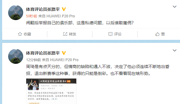 前 《全体育》总编辑、《跑者世界》总编辑张路平:周琦是有点天分的,但情商的缺陷和遇人不淑,决定了他必须连续不断地出昏招,退出新赛季这种事,获得的只能是倒彩。也不看看现在啥形势。 闹翻后举报自己的俱乐部,这是私德问题,以后谁敢雇佣?