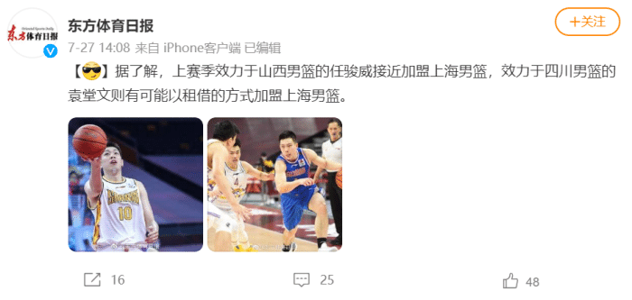 袁堂文将以租借方式加盟上海,消息源来自于东方体育和名嘴朱彦硕爆料!这位通过选秀进入CBA的年轻后卫,进步快速,擅长传球和抢断。看看上海队的阵容吧,再加上外援,这样的阵容如果不是以夺冠为目标实在是说不过去了!