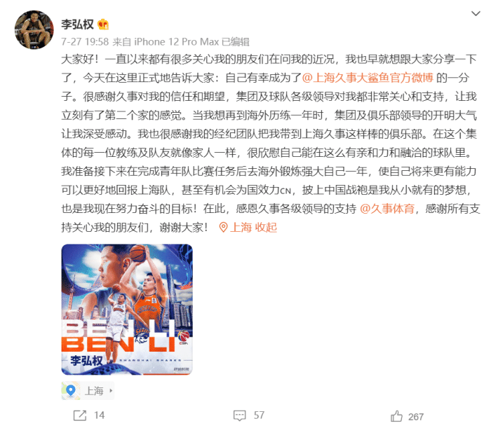 李弘权在7月底的时候就发微博宣布加盟上海队了,这位更换为中国国籍目前效力于NCAA的出色锋线摇摆人,表示目前希望在海外再磨练一年,很可能会尝试冲击NBA或者打夏季联赛,但他的签约权已经归属于上海队了。也就是说从海外归来他就会加盟,意味着上海队又得到一位年轻的猛将!