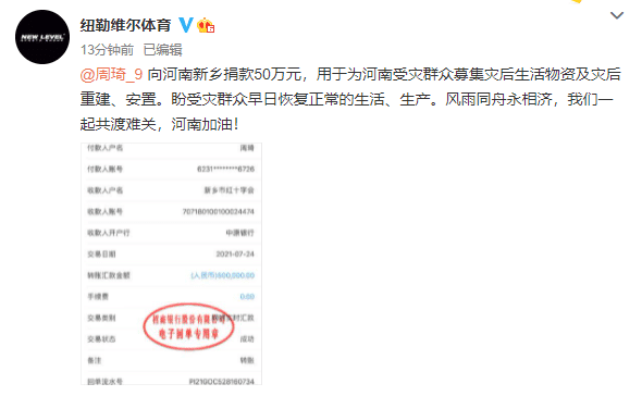 救灾,捐款成为了很多球员尽自己绵薄之力的办法,周琦的经纪人睢冉很快在社交媒体上秀出了自己和周琦(50万)的捐款截图,并且睢冉在随后又更新社交媒体表示,受到周琦的号召,他代表公司再一次捐款20万,睢冉的这一波操作堪称高调,不过因为是捐款,他也罕见的没有受到球迷的攻击。