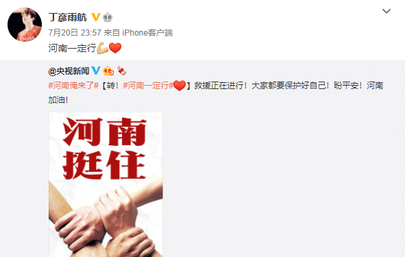 山东男篮球员丁彦雨航写道:河南一定行,加油爱心。